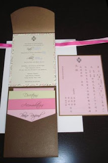 Tulips will be in season when FH and I get married, and I love the look of clustered poms like those shown in this centerpiece collection. Plus, it has the floating candle in a vase with water, one of the simple but elegant choices we're considering in an effort to keep our wedding as "green" as possible.the pocketfold invitation. It keeps everything
